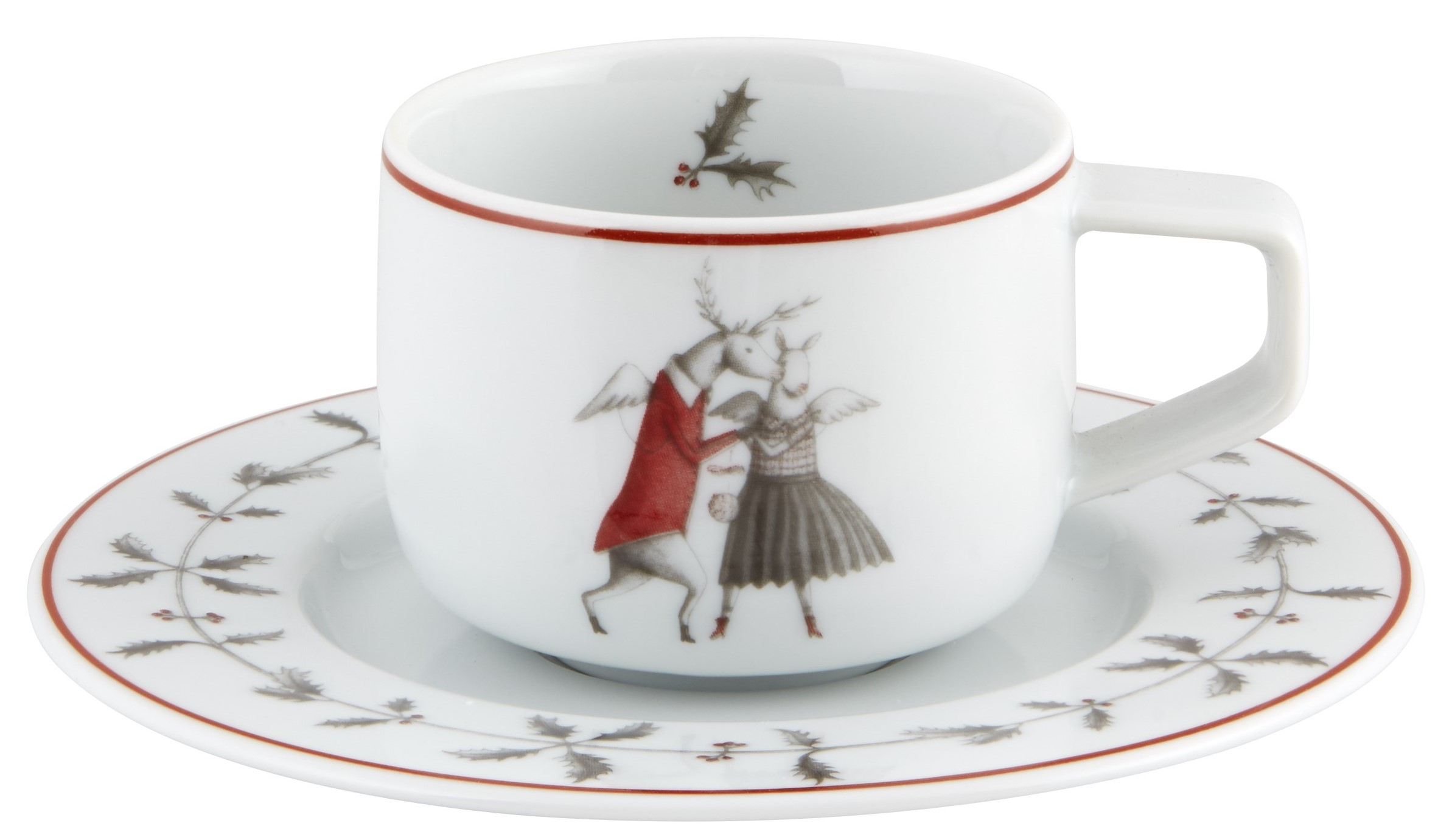 El Taza Café C/Platillo Danza decorado navidad "noel"forma parte de la colección de Vista Alegre Nöel. Es una nueva colección de Navidad para la mesa, diseñada por la artista portuguesa Teresa Lima. “La Navidad es una época para compartir, para reunir familiares y amigos, para sonreír y ayudar al prójimo llevados por un cálido sentimiento de amor. Este sentimiento es el que me llevó a elegir para esta vajilla dos animales de especies diferentes, un reno y un conejo, que simbolizan el amor universal que no ve género, raza, edad o estatus social.”