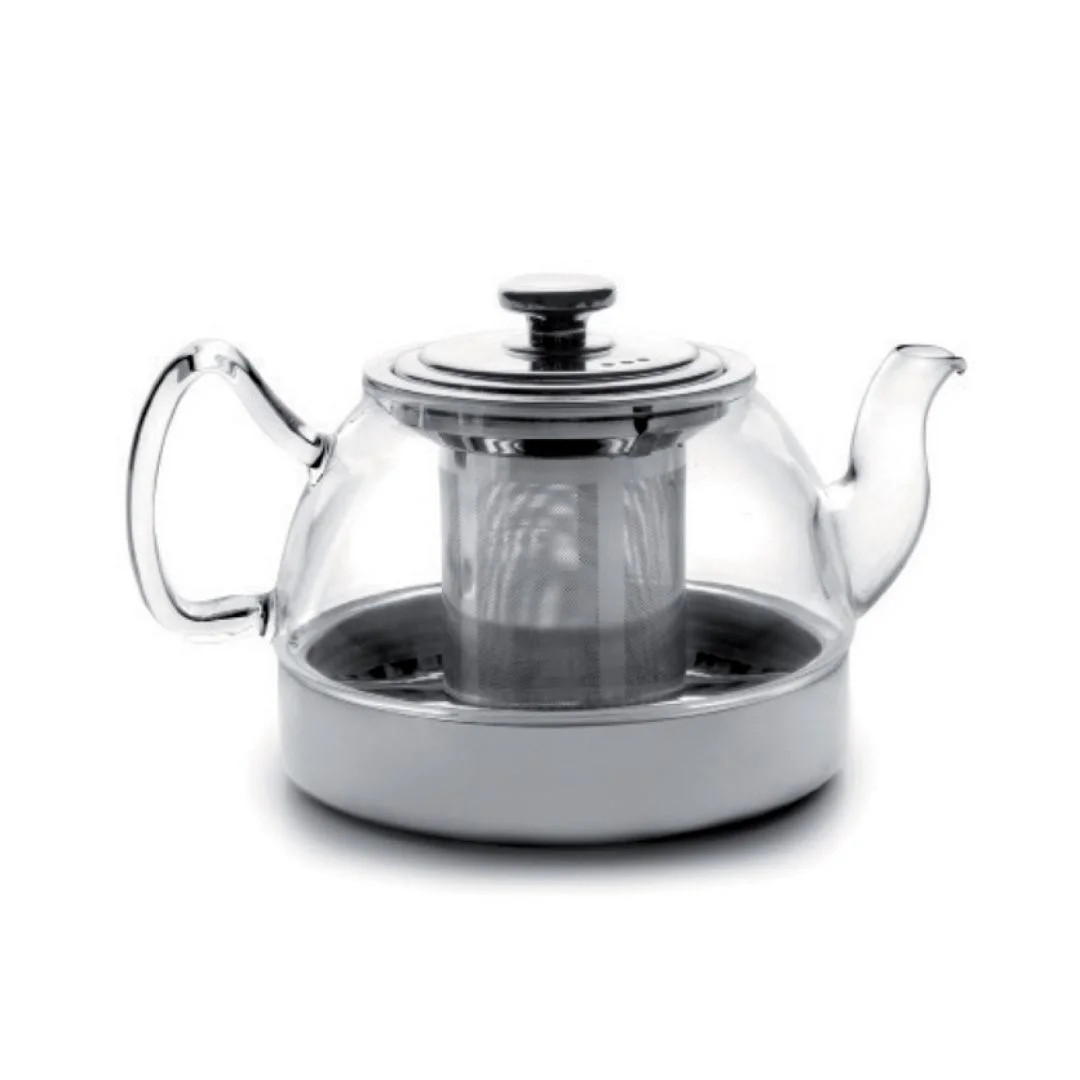 Tetera de vidrio borosilicato con filtro inox apta para inducción. Ideal para infusiones y servicio directo en mesa con máxima versatilidad.