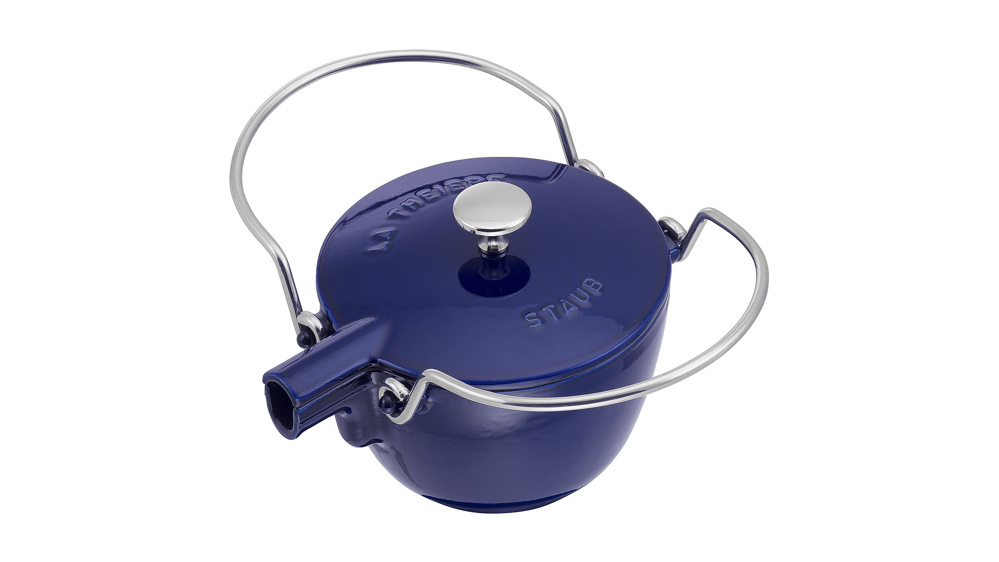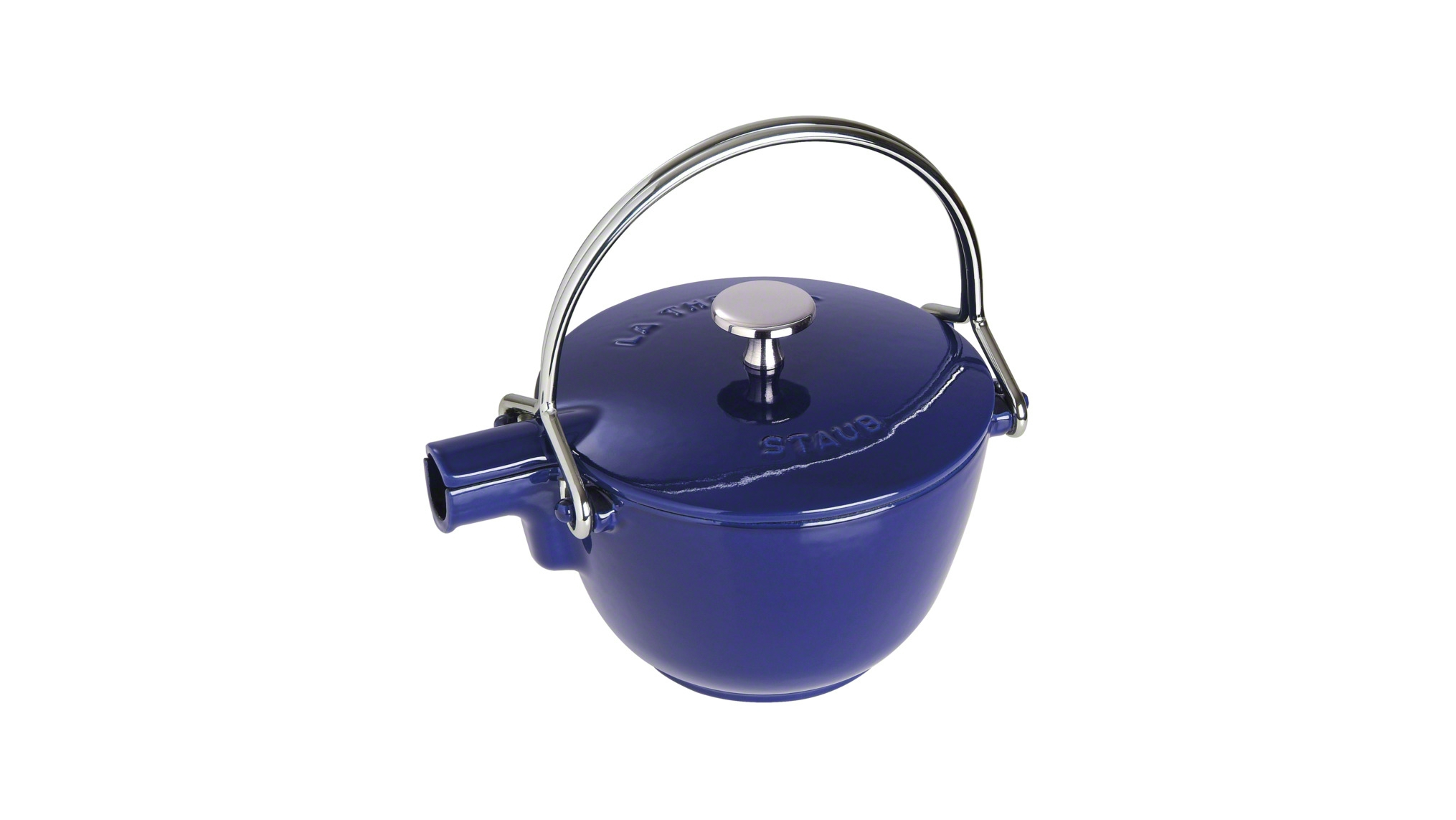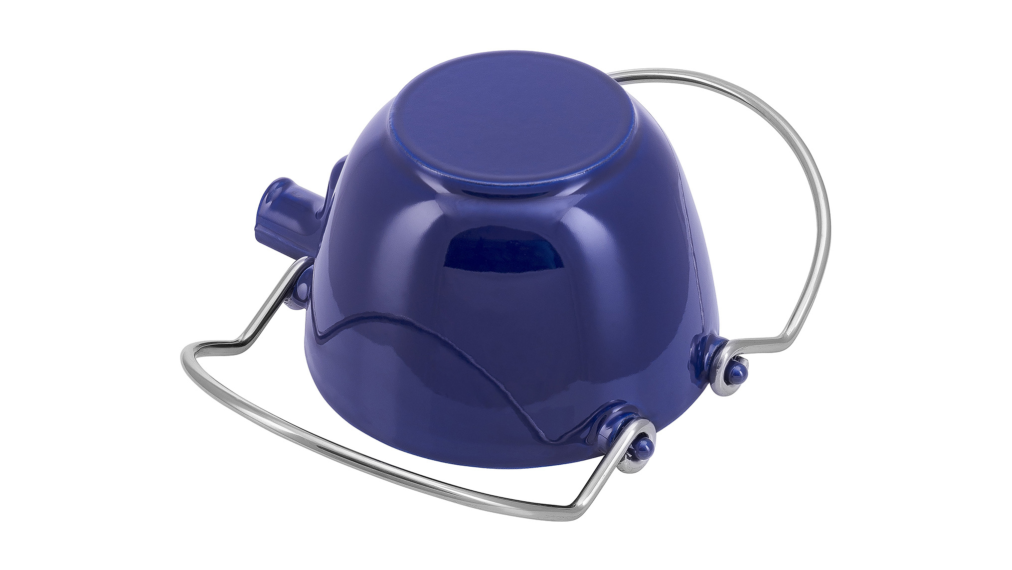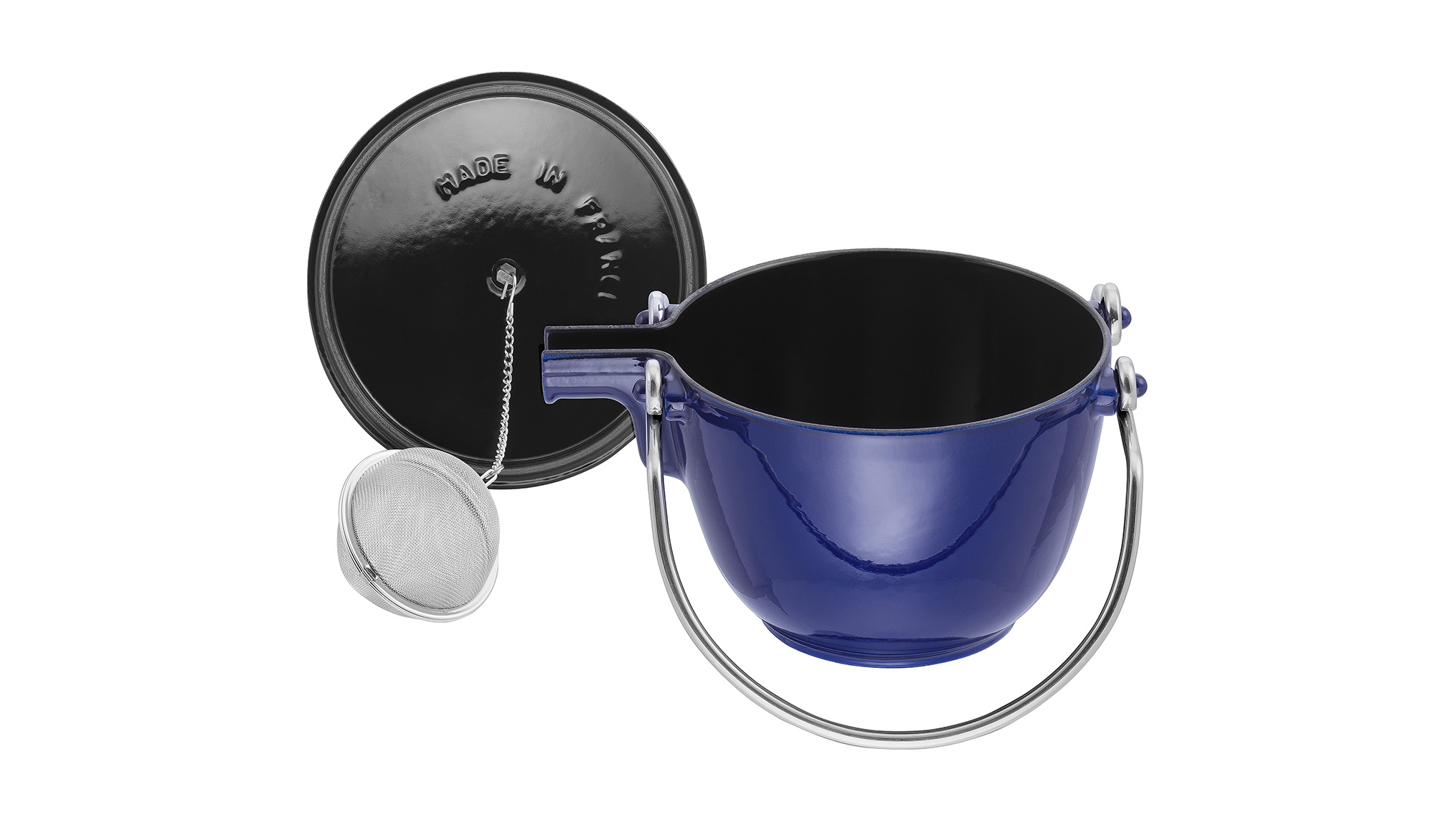 La pequeña tetera redonda de color azul oscuro es al tiempo tetera y hervidor de agua. Tiene un soporte para el colador y un asa de acero inoxidable que cierra la tapa al verter el agua. Es apta para cualquier superficie de cocción, también para placas de inducción. Esta tetera tiene un diámetro de 16,5 cm, una altura de 18 cm y una capacidad de 1,15 litros. Está hecha de hierro colado con esmalte negro en el interior, este material retiene tanto el calor como el frío.Como todo el hierro colado ha de calentarse progresivamente evitando choques térmicos. De igual modo antes de lavar siempre hay que dejar enfriar.