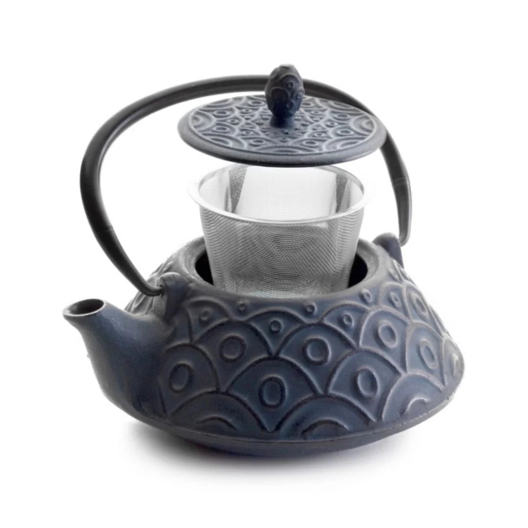 Tetera de hierro fundido Malasia con interior esmaltado y filtro inox. Diseño decorativo y alta retención del calor para hostelería.