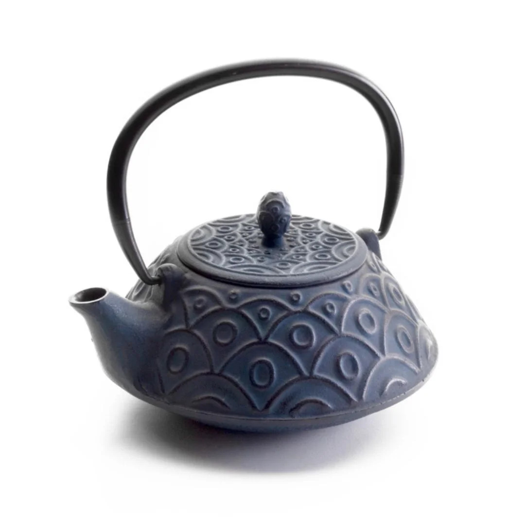 La tetera Malasia de hierro fundido está inspirada en las teteras japonesas tradicionales tipo tetsubin, destacando por su diseño en relieve con patrón ondulado que aporta un alto valor visual en mesa.