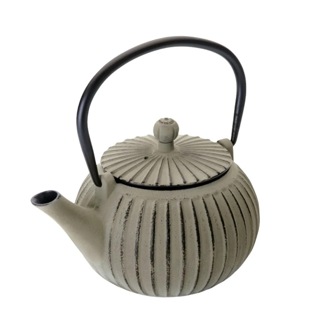 La tetera Nepal de hierro fundido está inspirada en las teteras japonesas tradicionales tipo tetsubin, destacando por su diseño con relieve vertical y acabado en tono claro que aporta un estilo más suave y actual.
