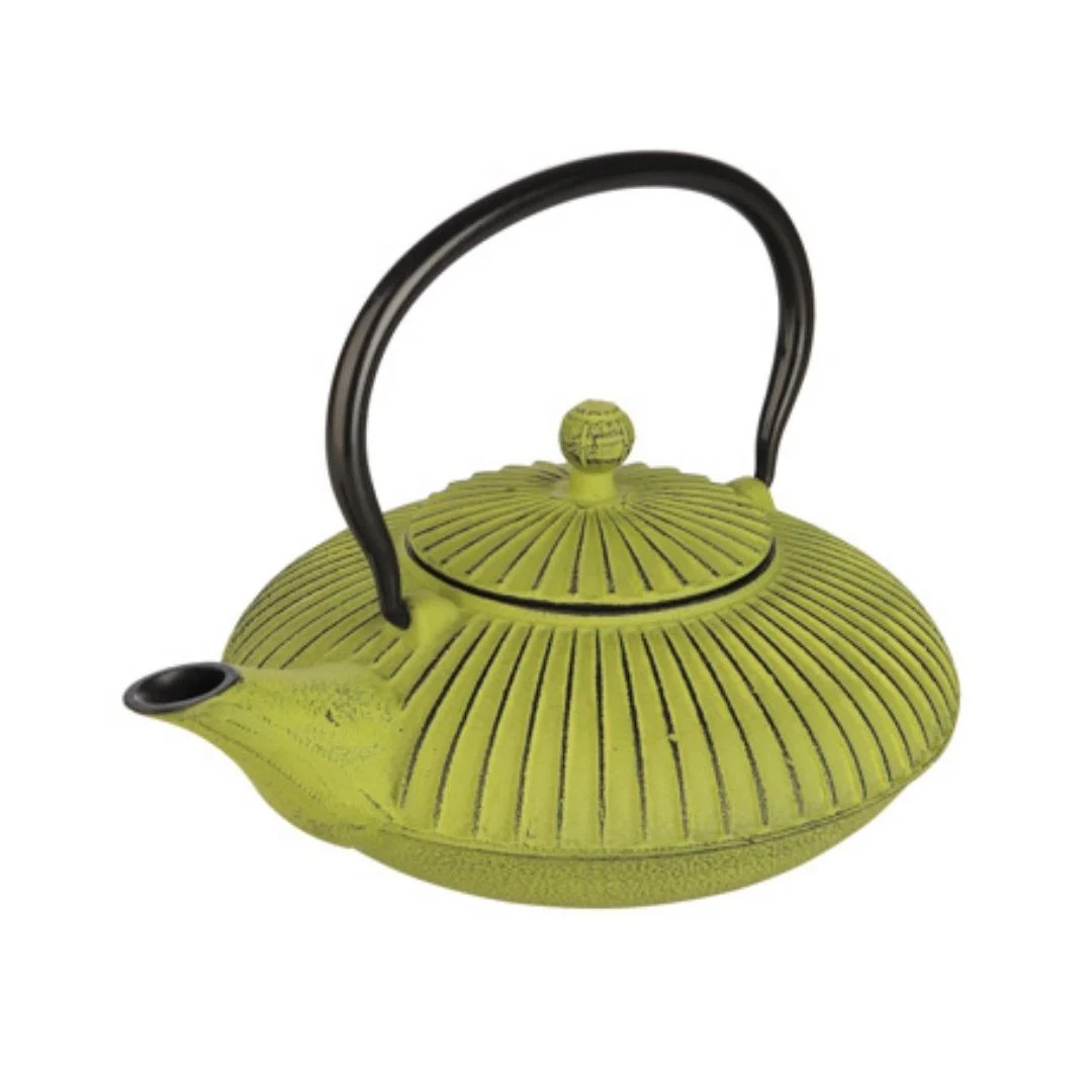 La tetera verde de hierro fundido está inspirada en las teteras japonesas tradicionales tipo tetsubin, destacando por su diseño bajo y sus líneas radiales en relieve que aportan estabilidad y valor visual en mesa.