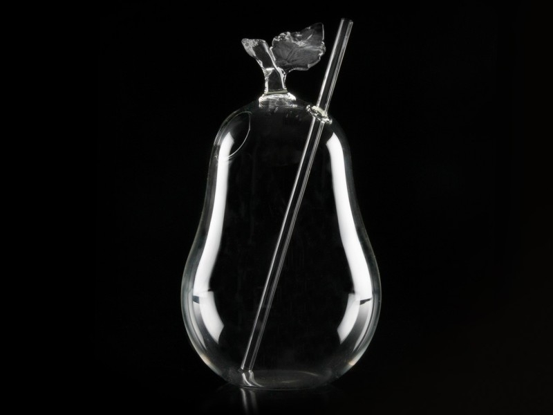 Vaso en forma de pera con hoja. Vaso soplado en vidrio borosilicato. Sirva refrescantes zumos, cocktails, ¡todo vale! Con agujero especial para rellenar con hielo y agujero para caña. Caña incluida de 20 cm. La capacidad de los productos puede variar debido a su proceso de fabricación artesanal. Diámetro del vaso 11 cm, altura 19 cm.