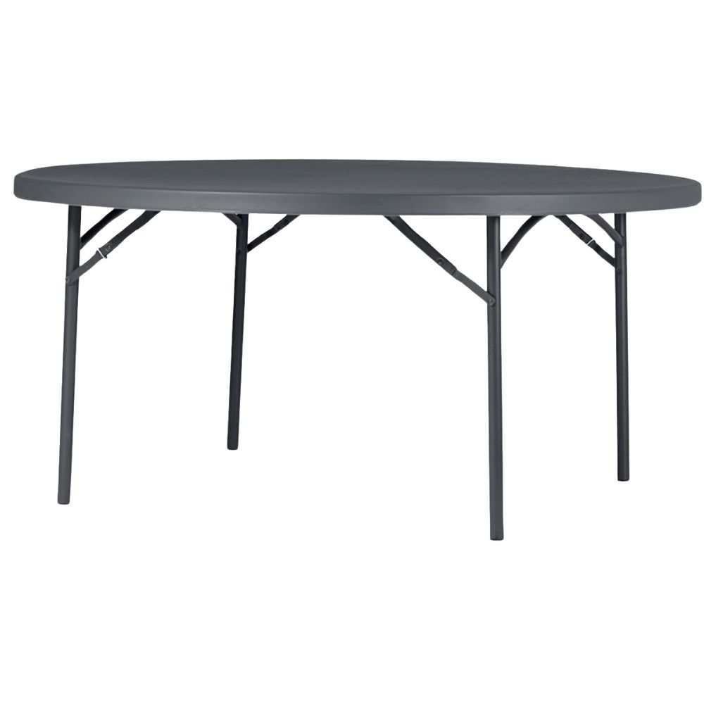 Mesa plegable redonda de Ø152 cm, con sobre en polietileno de alta densidad y estructura de acero. Capacidad para 8 comensales, ideal para eventos y hostelería.